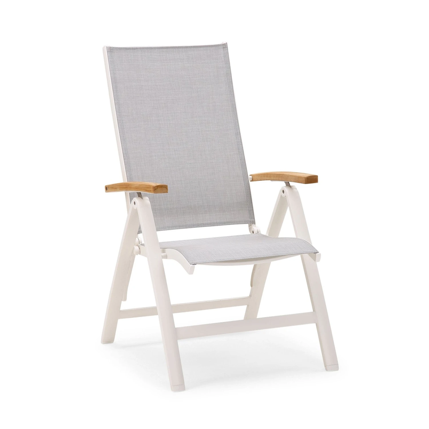Mit dem Klappsessel Cavalese / weiss m. Teakarmlehnen trifft Einfachheit auf Komfort: Ein schlicht-filigranes Design aus Alumium, Ergotex-Gewebe und Armlehnen aus Teakholz machen dieses Möbelstück zu einem treuen Begleiter im Sommer. Schnell und einfach zusammengeklappt lässt er sich nicht nur wunderbar verstauen, sondern auch transportieren. Für die Reinigung wird lediglich ein sauberes Tuch, eine Bürste und ein wenig Wasser mit Spülmittel bzw. Seifenlauge benötigt. Die Sitzbezüge können kinderleicht abgenommen und gewaschen werden. Obwohl dieser Klappsessel ganzjährig im Garten oder im Haus genutzt werden kann, kann er für eine längere Lebensdauer zum Überwintern in eine atmungsaktive Folie gepackt werden. Dank der hohen Materialqualität haben Sie aber ohnehin lange Zeit Freude an diesem Sessel.
