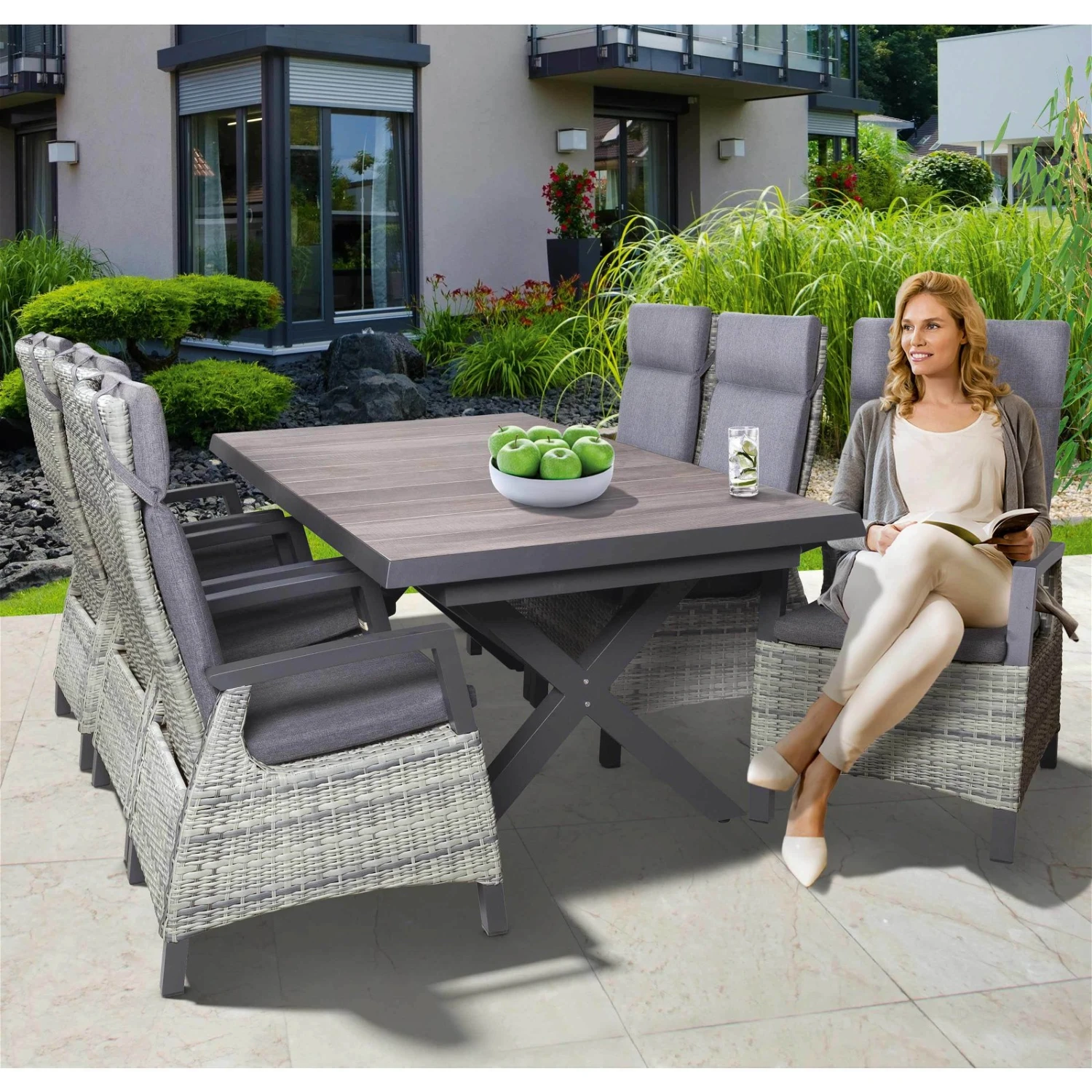 Der Geflechtsessel Bremen – Kölle macht nicht nur optisch eine gute Figur: Das robuste Aluminium-Gestell ist rostfrei, sehr belastbar sowie witterungs- und wetterbeständig. Da Aluminium an sich ein eher leichtes Metall ist, können Sie diesen Gartensessel bequem von einem Ort zum anderen tragen. Teilweise ist das Gestell mit einem Geflecht aus Kunststoff umspannt, was in der Kombination sehr modern wirkt und sich optimal an nahezu jedes Ambiente anpasst. Für mehr Komfort sorgt die stufenlos verstellbare Rückenlehne. Auch Sitz- und Rückenpolster bieten Bequemlichkeit. Diese können nach Belieben abgenommen und gewaschen werden. Das Gestell müssen Sie lediglich mit ein wenig Wasser und Seife abreiben oder mit dem Gartenschlauch abspritzen. Im Allgemeinen ist der Geflechtsessel Bremen ganzjährig im Außen- sowie Innenbereich einsatzbereit.
