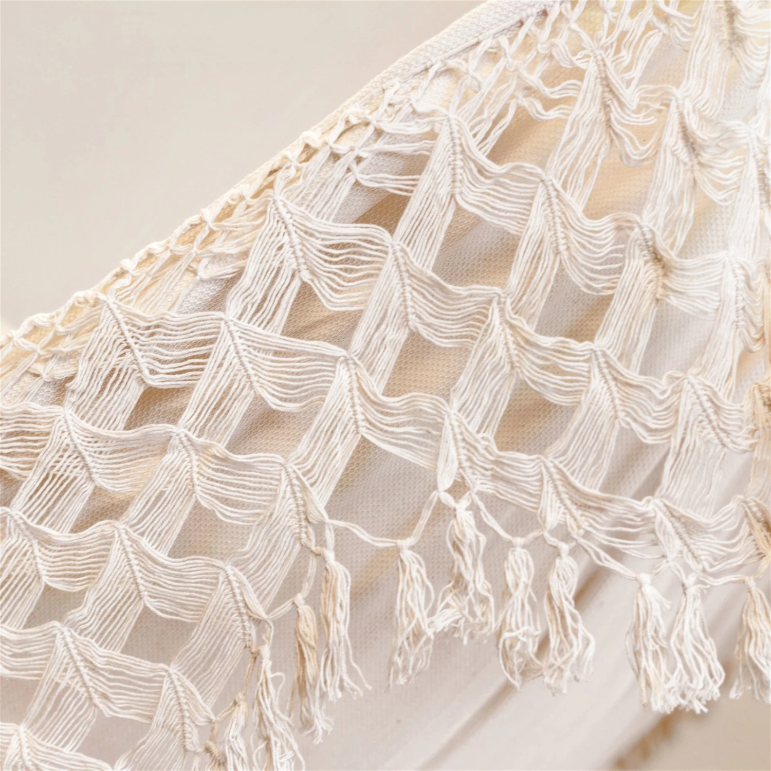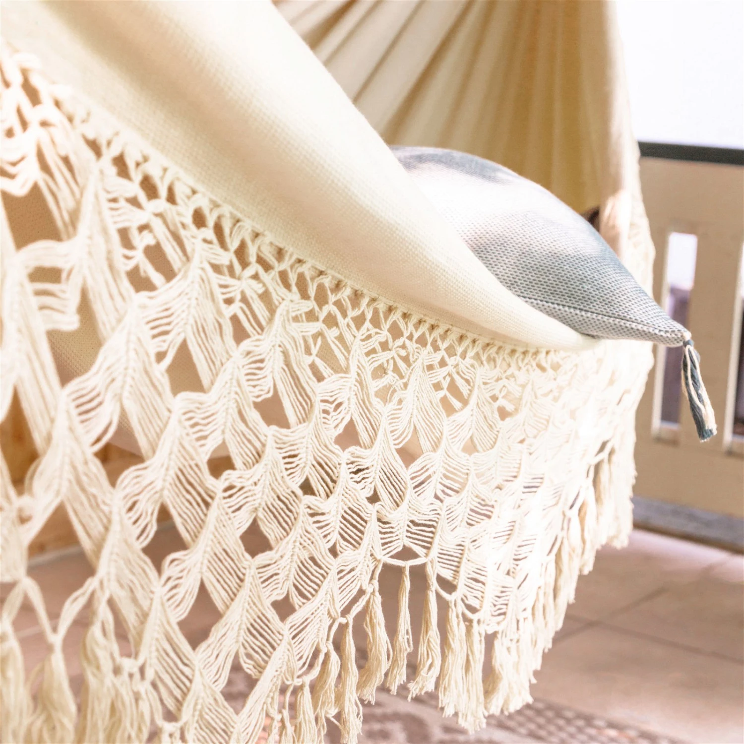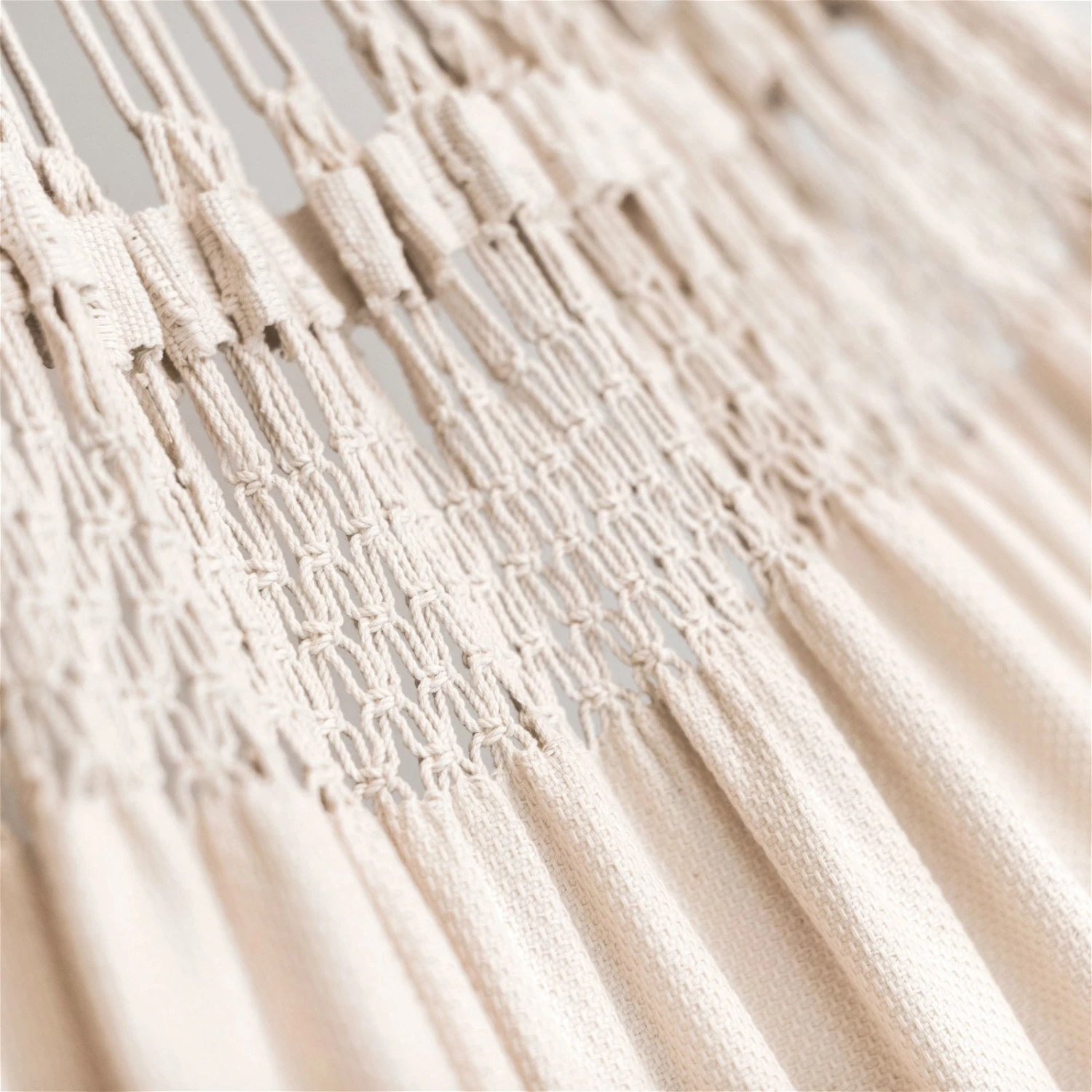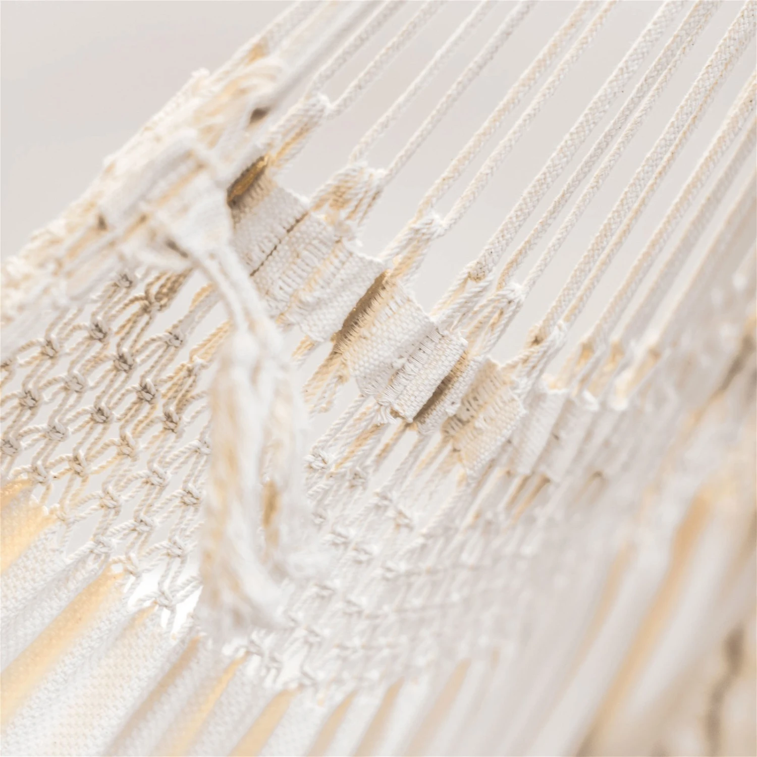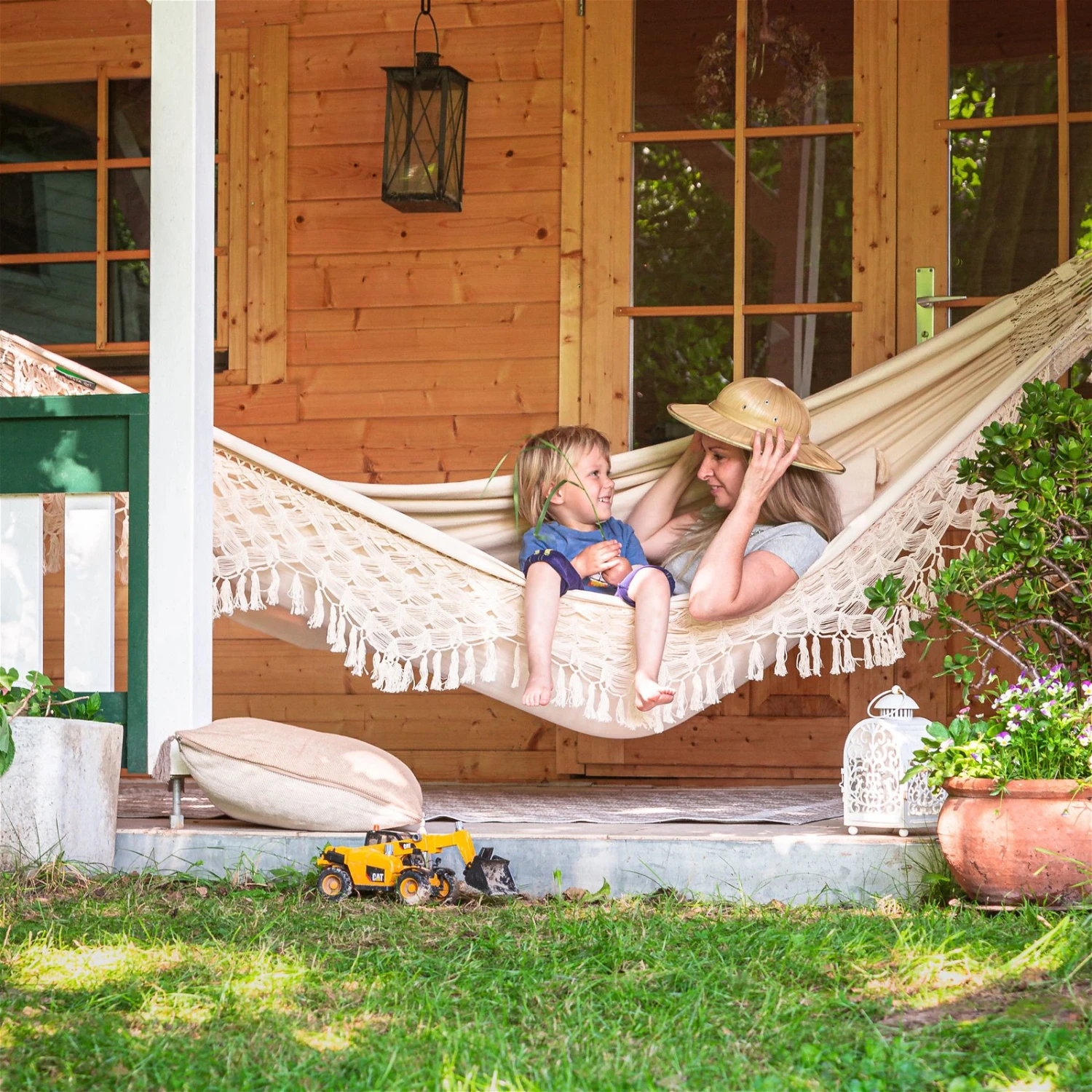 Wenn Sie gerne mit Ihrer Familie zusammen relaxen, werden Sie an der Kingsize Hängematte ‚Bossanova‘ in Beige viel Freude haben. Sie ist 180 x 400 x 180 cm groß und bis zu 200 kg belastbar. Die Kombination aus Bio-Baumwolle und reißfesten Webkanten gibt der Hängematte eine hohe Stabilität. Steigen Sie ein und fangen Sie an zu träumen!