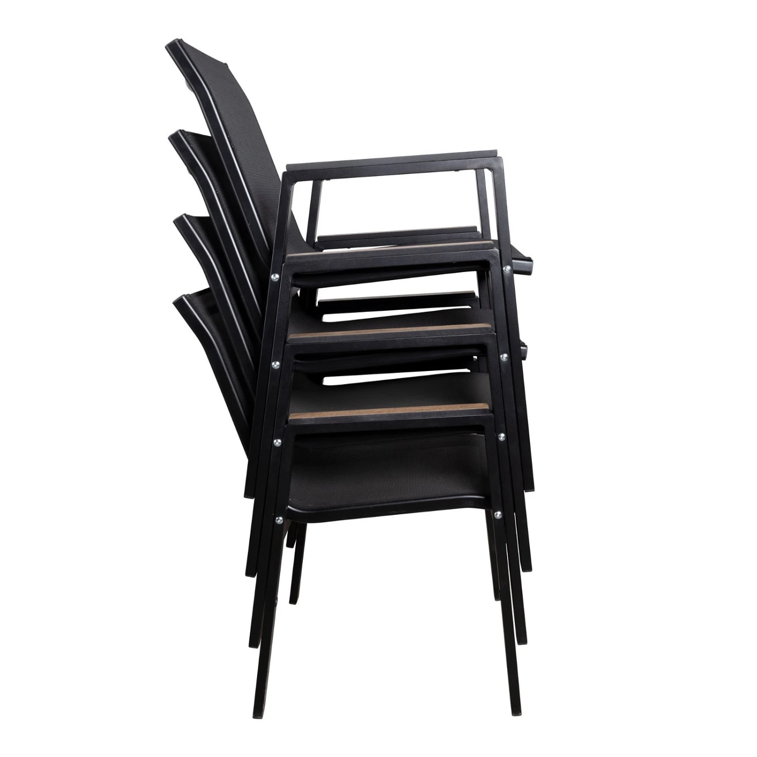 Der Stapelsessel in zeitlosem Look punktet mit einer durchdachten Materialkombination aus Alu und Textil. Die Armlehnen in Holzoptik verleihen dem Möbelstück einen schicken, rustikalen Akzent. Als Element einer Essgruppe oder als eine unkomplizierte Sitzgelegenheit im Garten macht dieser schwarze Stapelsessel eine gleich gute Figur.
